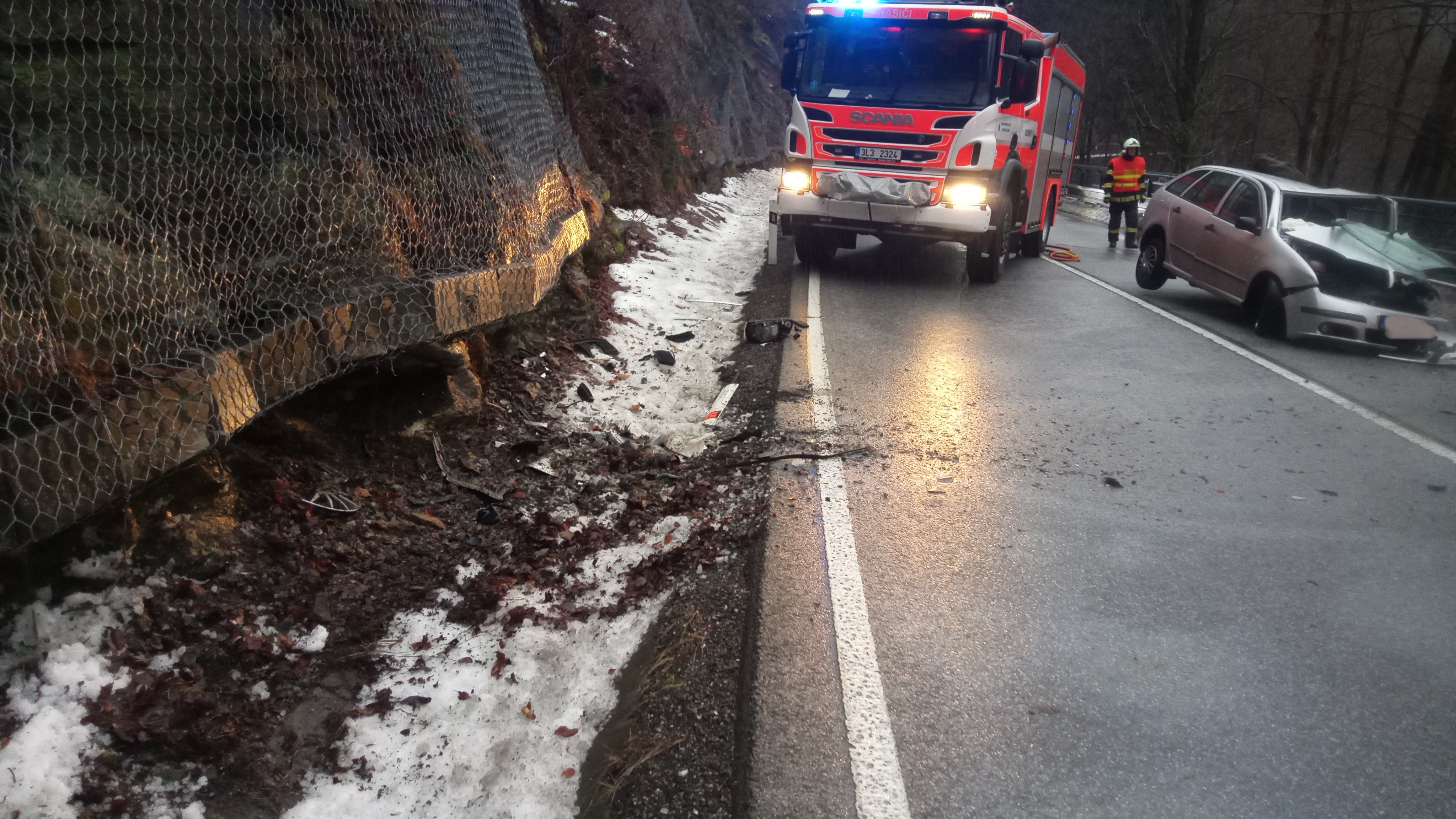 6/2025 28.1. v 6:59 hod. DN, najetí automobilu na spadlý kus skály, komunikace 1/14 Rokytnice - Vilémov